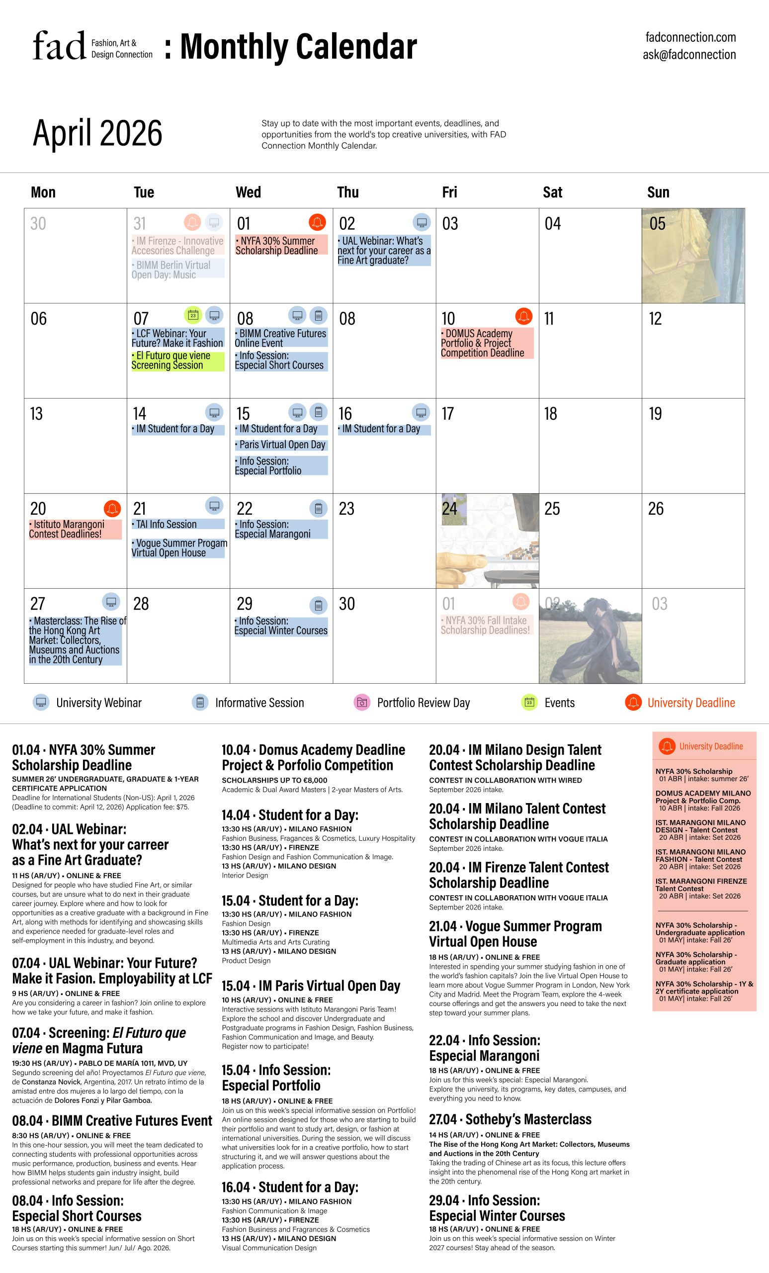 Discover everything happening this month across our network of creative universities. From info sessions and webinars to portfolio reviews and key deadlines, April is full of opportunities to take your next step in art, design, and fashion.
