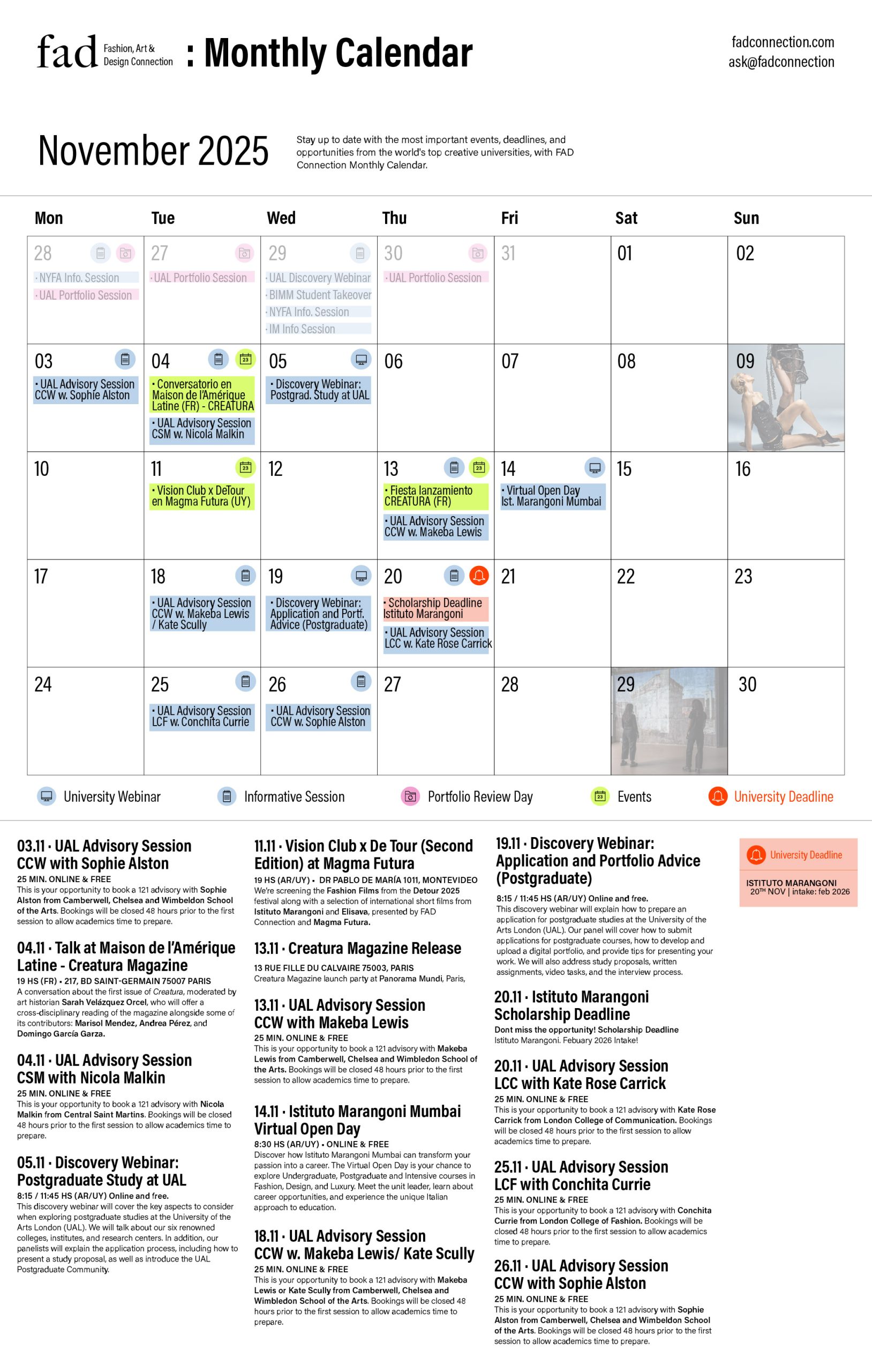 This month includes personalized advisory sessions with the University of the Arts London, featuring academics from Camberwell, Chelsea, Wimbledon, and London College of Fashion. There will also be two Discovery Webinars focused on portfolio development and postgraduate applications.
